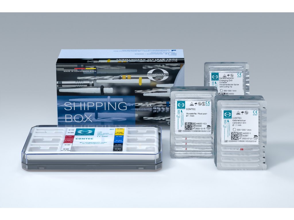 COntec Standart set obsahuje: 3ks červených čepů ⌀1,1mm, 5ks bílých čepů ⌀1,3mm, 5x žlutých čepů ⌀1,5mm, 5ks modrých čepů ⌀1,75mm, 3ks černých čepů ⌀2mm. 5ks fréz k čepům Cytec k jednotlivým velikostem, 2ks předvrtávačů s aktivní a neaktivní špičkou + plastový organizér.